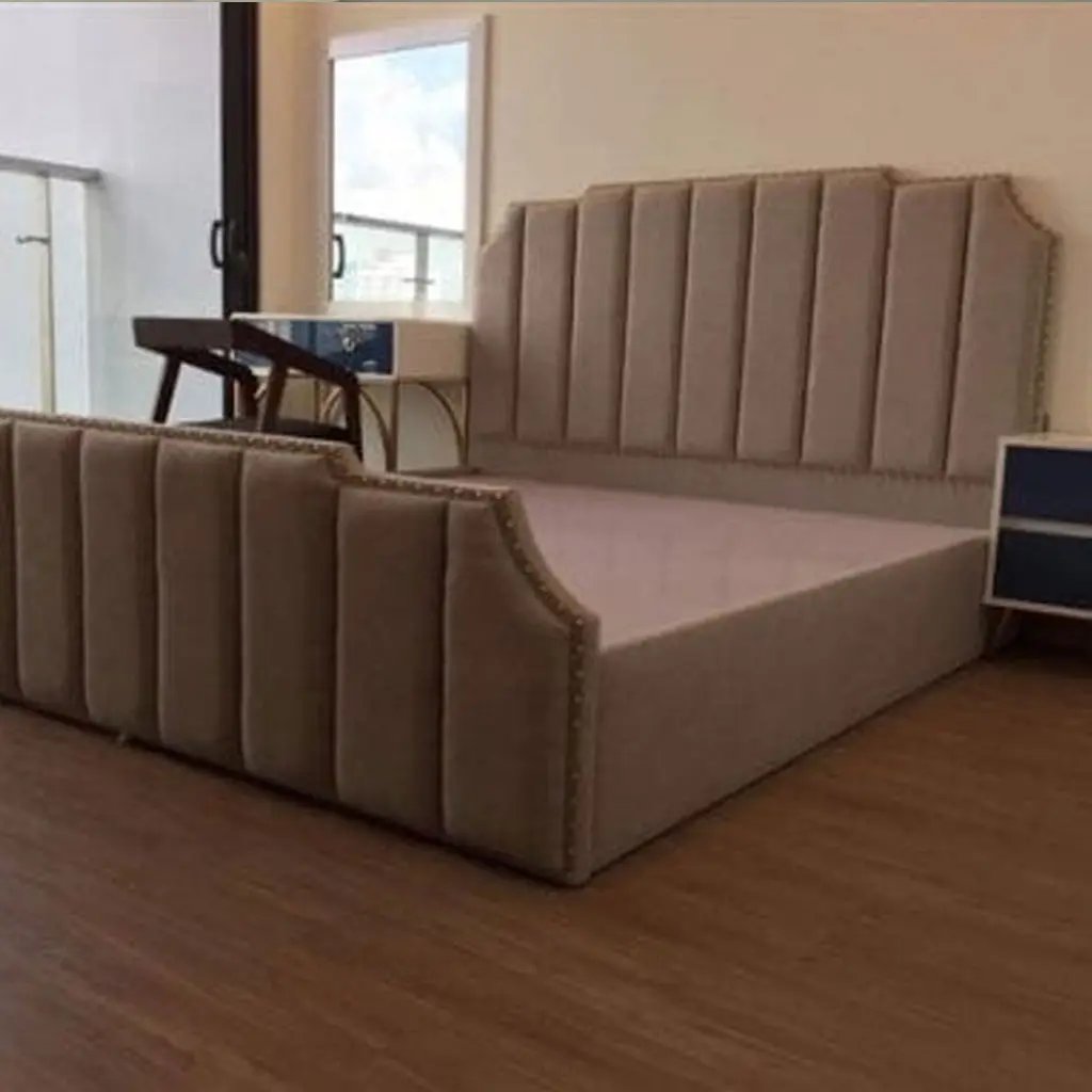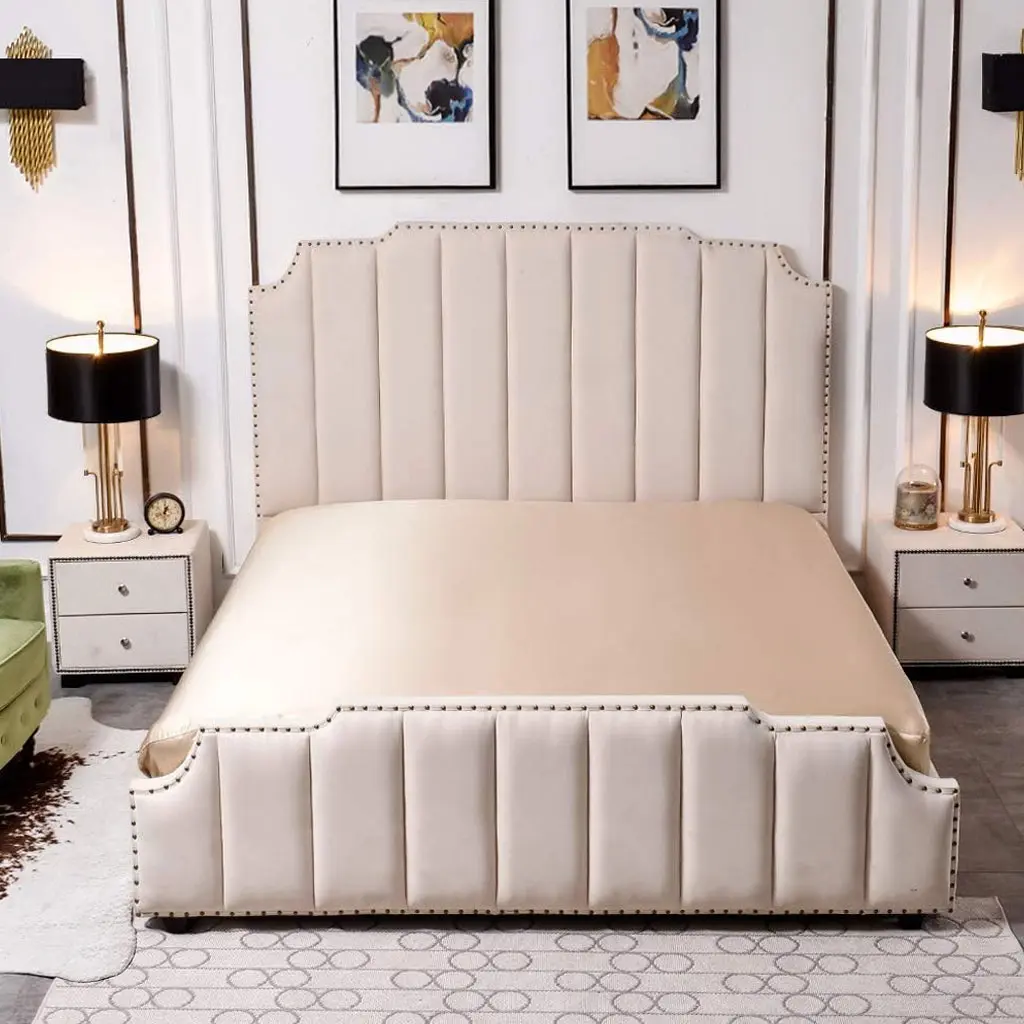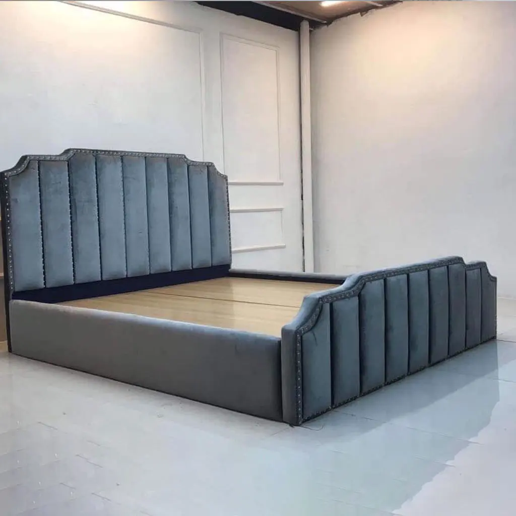 – Chân giường ngủ bọc nỉ thấp lại được làm bằng chất liệu gỗ tự nhiên giúp giường thêm sự vững vàng hơn; tạo chỗ nằm thư giãn thật thoải mái và chắc chắn cho gia chủ khi ngủ nghĩ, thư giãn. Đầu giường được thiết kế dạng vòm, bọc nệm kết hợp chần nút (rút múi) đây là kiểu thường thấy trong các giường tân cổ điển gây ấn tượng bởi vẻ đẹp đặc biệt tinh tế, sang trong cho chiếc giường ngủ khi bày trí bên trong không gian nội thất.