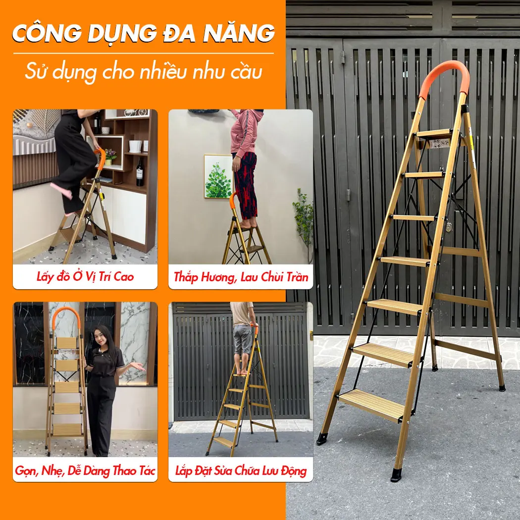 Tên sản phẩm: Thang Nhôm Ghế Tay Vịn Gold – Bậc Thang To Dễ leo Trèo, Thang Nhẹ Nhôm Dày Giá Rẻ