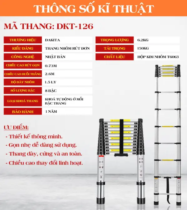 THANG NHÔM RÚT GỌN DAKITA DKT-126 CHÍNH HÃNG – THANG TỐT – GỌN – NHẸ – XÀI BỀN.