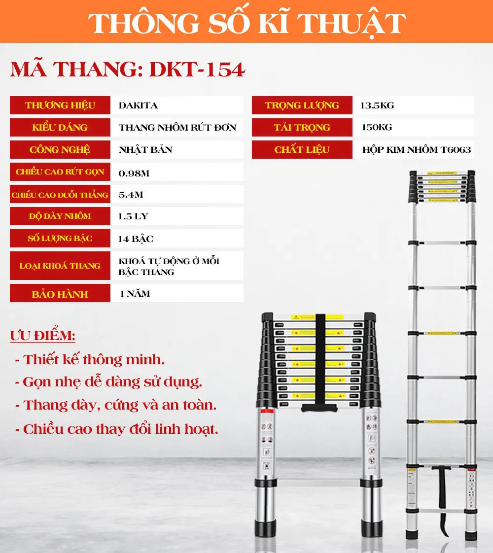THANG NHÔM RÚT GỌN DAKITA DKT-154 CHÍNH HÃNG – THANG TỐT – GỌN – NHẸ – XÀI BỀN.