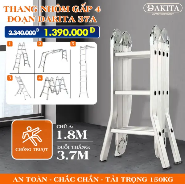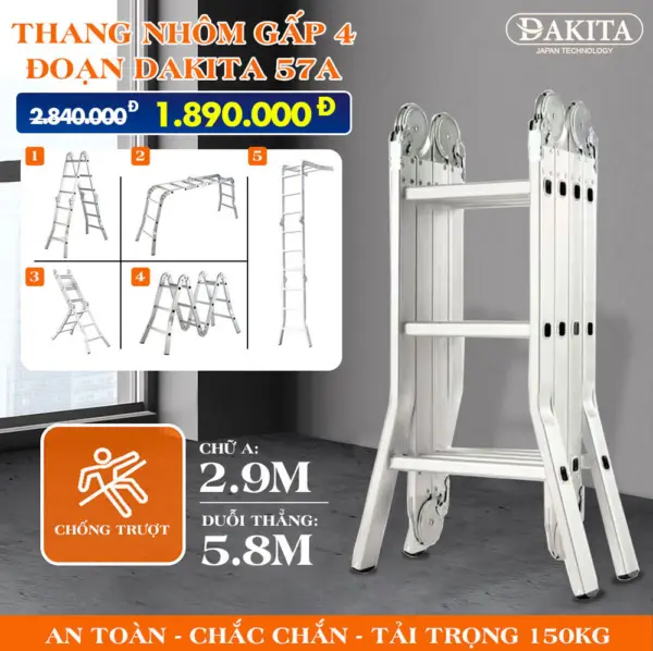 Tên sản phẩm: Thang Nhôm Gấp 4 Đoạn DAKITA Model DKT – Thang Nhẹ, Nhôm Dày, Thang Đa Năng Linh Hoạt Nhiều Kiểu Dáng
